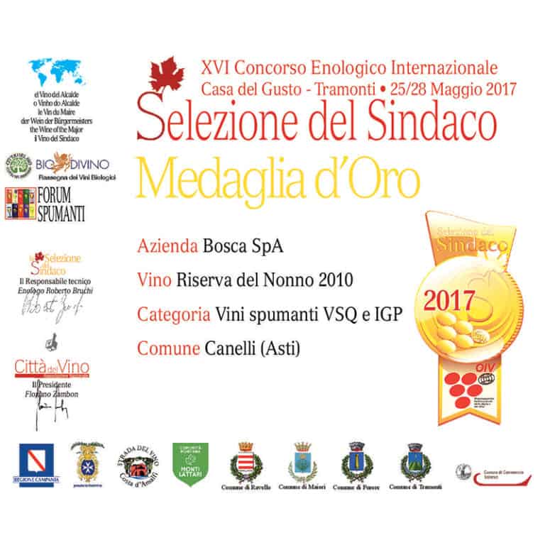 Il Metodo Classico Riserva del Nonno 2010 Bosca ha conquistato la medaglia d’oro al concorso enologico internazionale “La Selezione del Sindaco”.